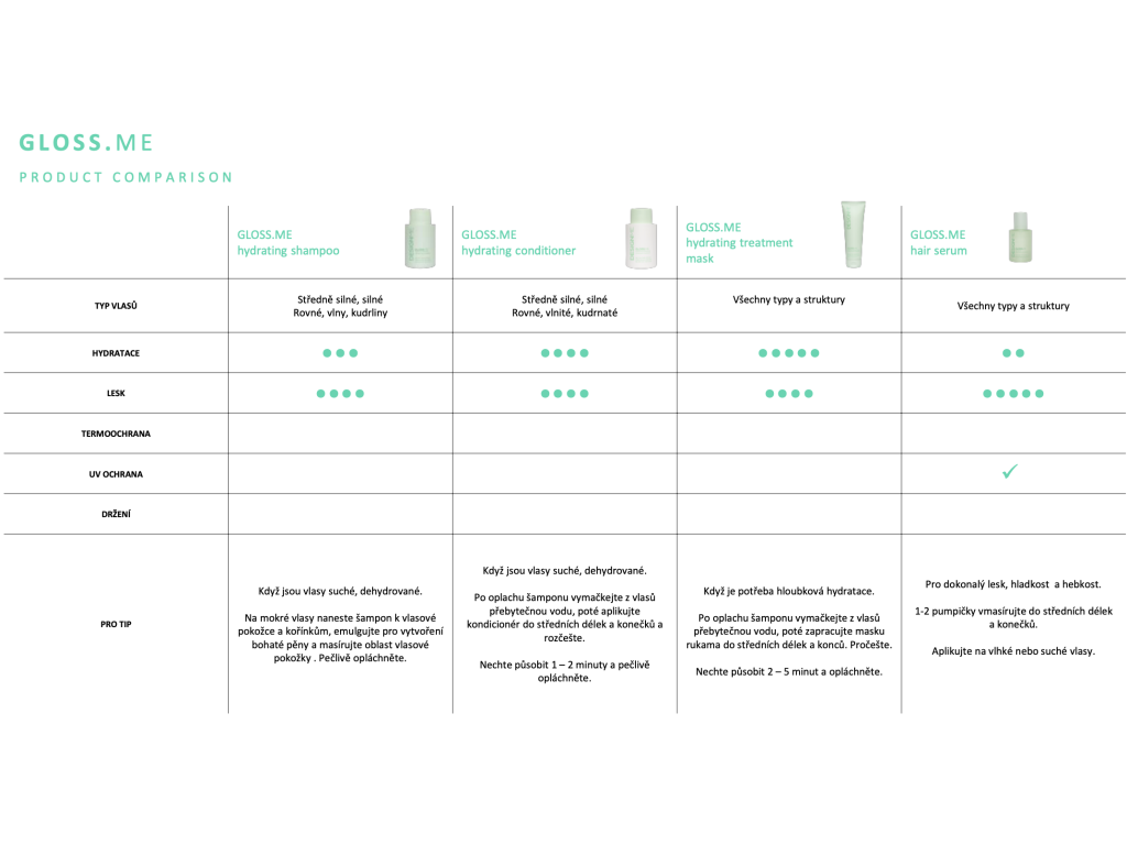 GLOSS.ME hair serum má recepturu obohacenou výživnou směsí olejů, vitamínů a proteinů a zanechá vlasy hladké a lesklé, aniž by byly zatížené. Vlasy mají svůdný lesk a sametovou hebkost jen s několika zázračnými kapkami séra.