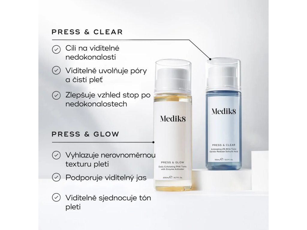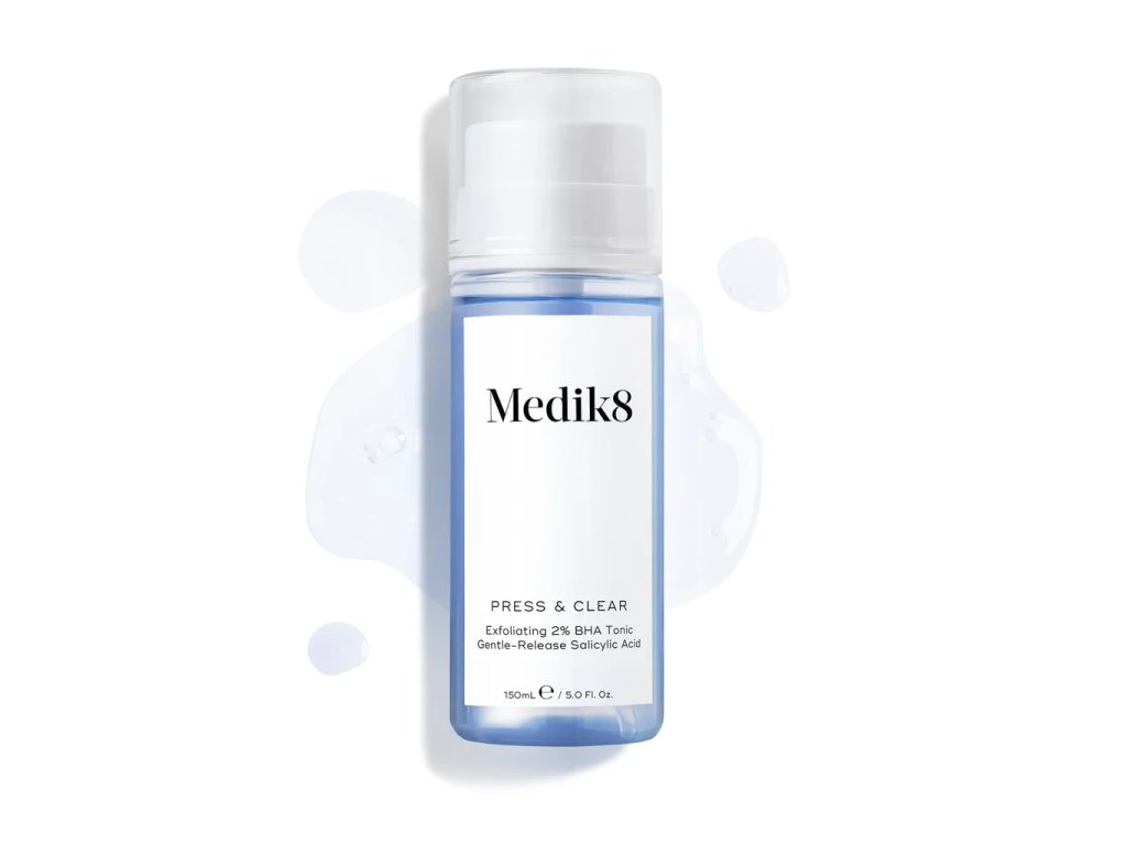 Získejte krásnou, zářivou pleť bez akné, rozšířených pórů a nadměrné pigmentace díky toniku Press & Clear od Medik8. Obsahuje kyselinu salicylovou s postupným uvolňováním, je proto vhodné i pro nejcitlivější pleť, kterou nedráždí.