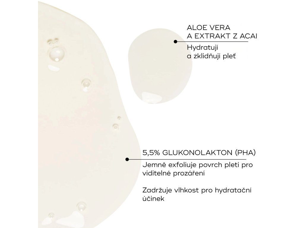 Vysoce účinná, ve vodě rozpustná PHA kyselina, která se v pleti přeměňuje na kyselinu glukonovou. Ta pleti poskytuje jemnou exfoliaci a hydrataci, což vede k viditelnému zjemnění jejího povrchu.