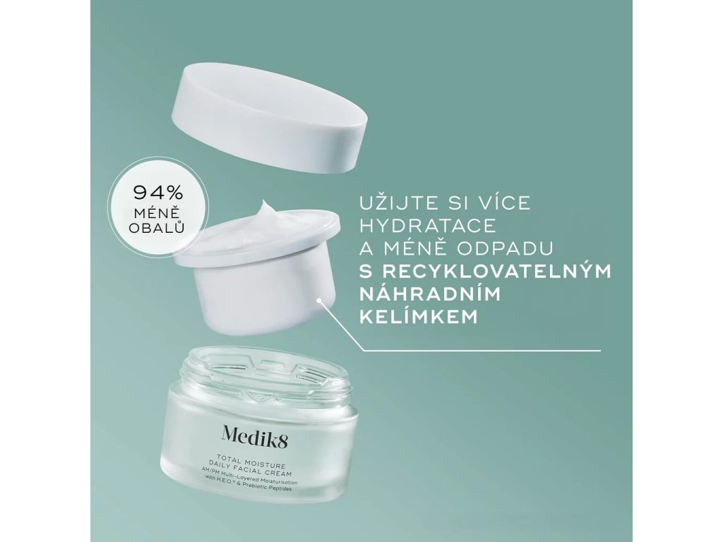 TOTAL MOISTURE DAILY FACIAL CREAM přináší na trh první plně recyklovatelnou nádobku Medik8 a recyklovatelné náplně. Plastové prvky obalu jsou vyrobeny z 30 % recyklovaného materiálu a celý produkt je recyklovatelný (všechny materiály vnější skleněné nádoby, vnitřní nádoby a víčka jsou recyklovatelné). Při koupi náhradní náplně je spotřebováno o 94 % méně obalů než při koupi nového balení a můžete ušetřit téměř 1 kg obalů/rok (při spotřebě 6 náplní za rok).